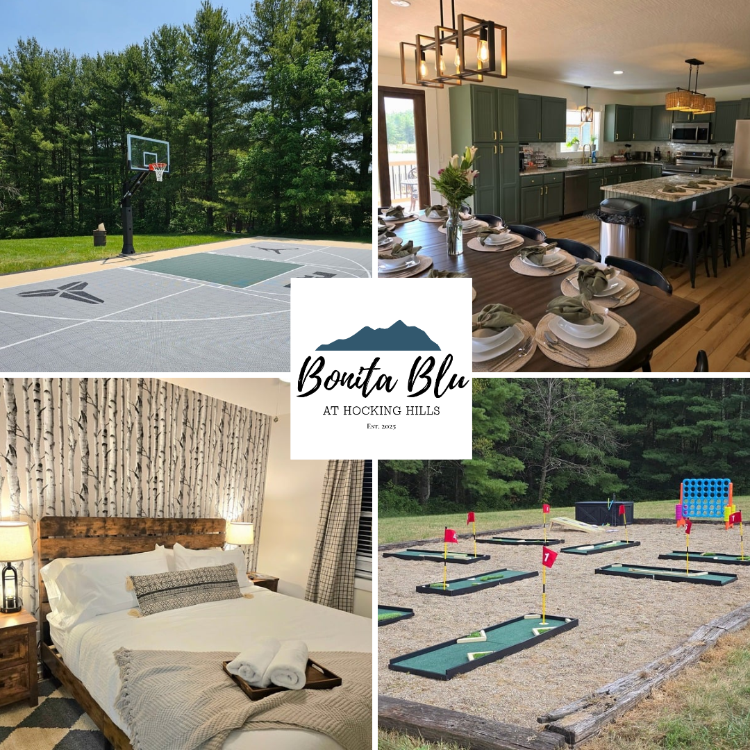 Bonita Blu is a newly renovated home on 5-acres with room for the whole family and more! This spacious and tranquil luxury vacation home in the heart of Hocking Hills sleeps 8–16 and only 8 minutes from Old Man’s Cave, waterfalls, and hiking trails. Enjoy the recreation friendly amenities of pickleball/basketball, 9-hole putt putt, 7 person hot tub, swimming pool, arcade game loft, and a basement bar and billiards area. Explore Hocking Hills adventures by day and relax in your private nature retreat by night—YOUR PERFECT BASECAMP AWAITS!